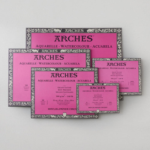 Papel moldeado de calidad superior de los molinos Arjomari de Francia. Hechos de trapo 100%, estos bloques de 300 gramos proporcionan un surtido conveniente de tamaños y superficies que son ideales para el trabajo de campo.