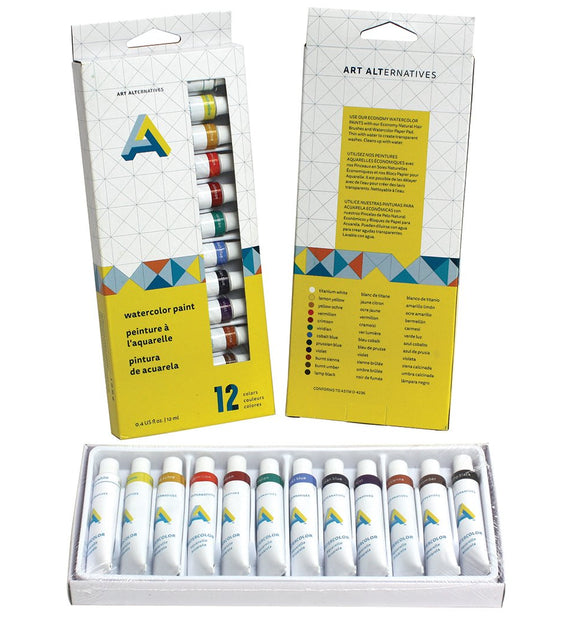 Economy Watercolor Paint Sets are ideal for beginners, students and value-conscious artists. These sets feature 12ml tubes of vivid colors which can be mixed with water. The 24-Color Set includes titanium white, lemon yellow, medium yellow, orange, vermilion, scarlet, magenta, crimson red, violet, ultramarine blue, cobalt blue, cerulean blue, phthalo blue, deep blue, viridian, light green, deep green, sap green, yellow ochre, burnt sienna, burnt umber, raw umber, Payne's gray, black and a paint brush.