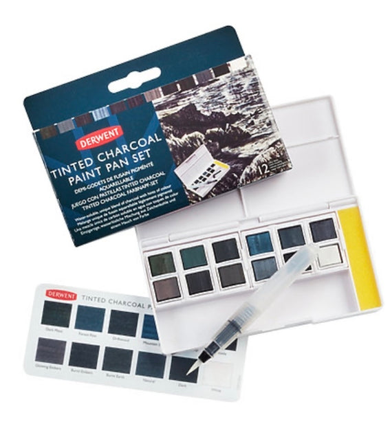 Las sartenes de pintura de carbón tintada contienen pinturas de carbón tintadas de forma única que son solubles en agua. Agregando solo un toque de color a la base de carbón, esta paleta de 12 tonos profundos y apagados proporciona un alto nivel de control creativo con una bandeja blanca para resaltar. Cada color se mezcla rápida y fácilmente, creando resultados atmosféricos y expresivos con un acabado mate y texturizado. Mezclar los colores húmedos, aplicar en capas y levantar, difuminar o dibujar sobre cuando esté seco. Este conjunto compacto y autónomo contiene 12 bandejas de pintura de carbón tintadas, cinco paletas de mezcla y una esponja para limpiar el mini cepillo de agua incluido. El conjunto incluye colores musgo oscuro, pino del bosque, madera a la deriva, azul montaña, océano profundo, cardo, brasas brillantes, brasas quemadas, tierra quemada, natural, oscuro y blanco.