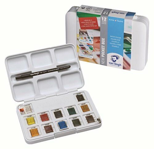 Las acuarelas de Van Gogh están clasificadas como una gama de pintura de nivel de estudiante y artista. Presentan colores brillantes, transparentes e intensos con un alto poder colorante. La mayoría de los colores están clasificados con el grado más alto de resistencia a la luz +++ (más de 100 años en condiciones de museo) con algunos colores clasificados solo un paso por debajo de ++ (25-100 años en condiciones de museo). Gracias a la pureza y la viscosidad uniforme, estas acuarelas son fáciles de trabajar y mezclar. Producido con orgullo en Holanda con un estricto control de calidad para una experiencia consistente con cada compra. Este juego de acuarelas de 12 medias pastillas viene en una caja de plástico y también incluye un pincel redondo de pelo sintético (tamaño 6) y una bandeja para mezclar. Los colores de este conjunto de selección general son: Blanco chino 108, Amarillo limón permanente 254, Amarillo azo medio 269, Rojo claro permanente 370,