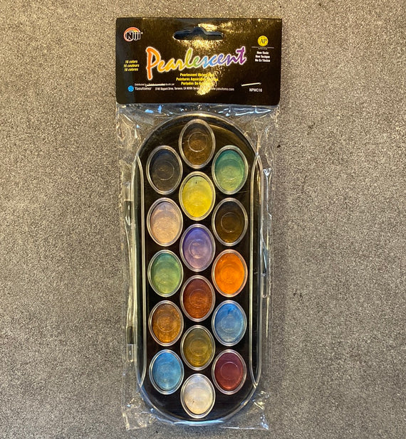 Conjunto de acuarela nacarada, 16 colores. Las acuarelas de la mejor calidad utilizadas por los pintores japoneses de acuarela y Sumi-e. Dieciséis colores no destiñen en un recipiente de plástico reutilizable. Añadirán dimensión y brillo a todas tus manualidades de papel. Se puede utilizar solo o con otras acuarelas. Ideal para pintar, sellar, tarjetas de felicitación y mucho más.