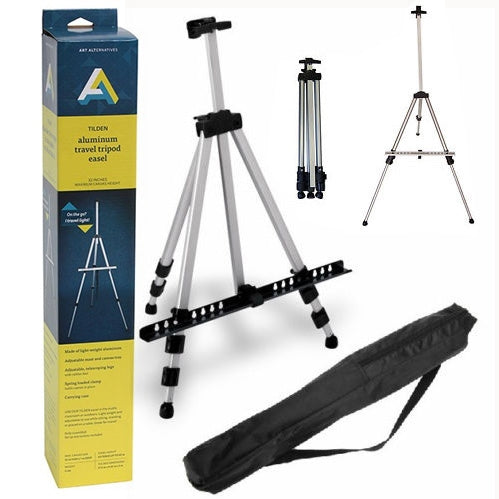 Ligero y ajustable para usar mientras está sentado, de pie o colocado en una mesa, el caballete Tilden es ideal para viajar. Hecho de aluminio ligero, pesa solo 2 libras, pero puede acomodar lienzos o paneles de hasta 32"h x 1"d. Una abrazadera superior con resorte asegura las lonas en su lugar y las patas telescópicas con pies de goma antideslizantes se ajustan fácilmente. La altura totalmente extendida es de 65" y se pliega a 21,5" x 4,25" x 3" para facilitar el almacenamiento y el transporte. Incluye un estuche de transporte con correa para el hombro. Premontado. Instrucciones de ajuste incluidas.