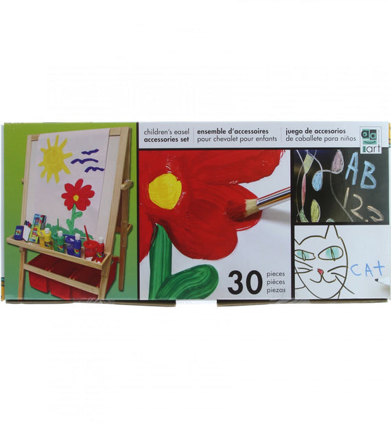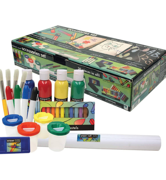Repleto de suministros para horas de diversión, este juego incluye cuatro botellas de pintura al temple líquida en rojo, azul, verde y amarillo; cuatro pinceles de cerdas naturales (el color del mango coincide con los colores de la pintura); cuatro botes de pintura a prueba de derrames (el color de la tapa combina con los colores de la pintura); cuatro marcadores de borrado en seco (rojo, azul, verde y negro); un borrador de tiza/pizarrón de borrado en seco; un rollo de papel y 12 pasteles de tiza en colores surtidos: ¡treinta piezas en total! Empaquetado en una colorida y atractiva caja de 4 colores. Dimensiones de la caja: 18.3" de ancho x 4" de profundidad x 9.75" de alto. Diseñado para mayores de 6 años.