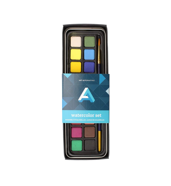 This set contains 36 one-inch round pans of vivid, non-toxic watercolors and a natural hair brush. The watercolors are easy-to-mix and clean up easily with soap and water.
