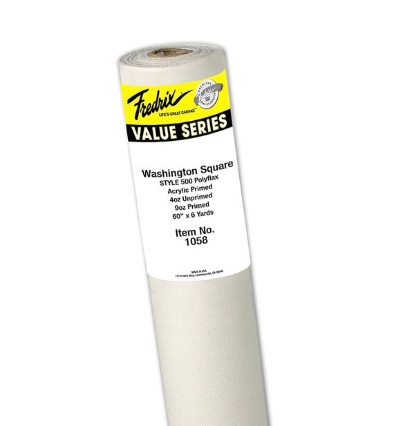 FREDRIX 500 WASHINGTON SQUARE es un lienzo mezclado de poliflax/algodón económico y ligero con una textura única y suave. 60" de ancho, 4 oz en bruto, 9 oz imprimado.