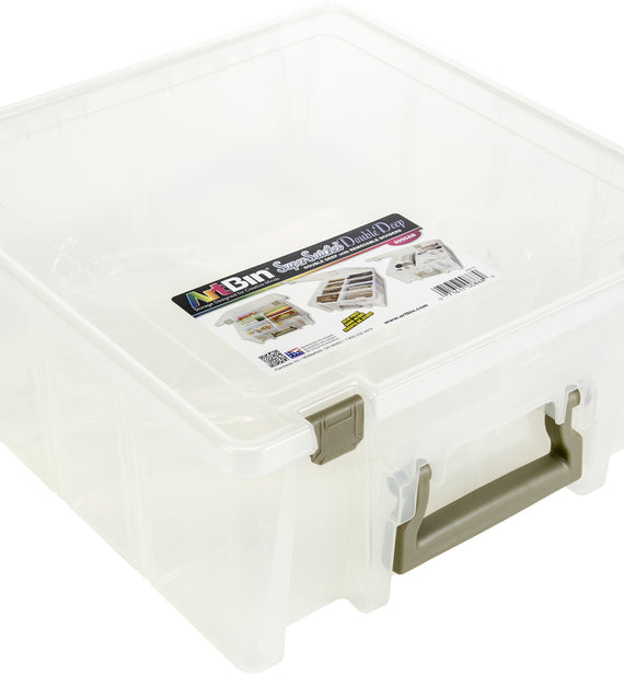 ART BIN-ArtBin Double Deep Super-Translucent con mango Taupe. La profundidad adicional permite el almacenamiento de suministros más grandes y voluminosos. Use Open Core (sin divisores) para cuadrados de colchas, trabajos en progreso, patrones, libros y más. Personalice usando divisores para paquetes de dijes y cuartos anchos. También admite la bandeja para hilos 6901AB (no incluida). Medidas generales: 15-1/4x14-1/4x6-1/2in.