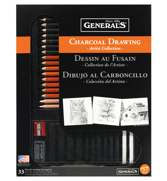 En su llamativa caja, el clásico set retro de General contiene todas las herramientas necesarias para empezar a dibujar de inmediato, incluyendo una goma de borrar y un sacapuntas. El kit clásico de carbón contiene 33 piezas, incluyendo lápices de carbón y palitos de carbón comprimido, tanto en blanco como en negro.