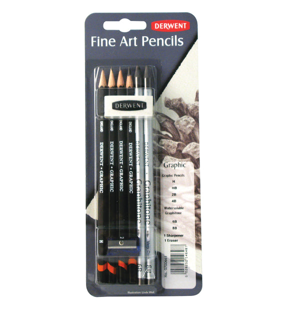 Graphic Mixed Media Set: incluye dos barras de grafitono solubles en agua (6B, 8B), cuatro lápices gráficos (4B, 2B, HB, H), un borrador de plástico y un sacapuntas.