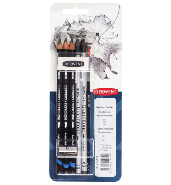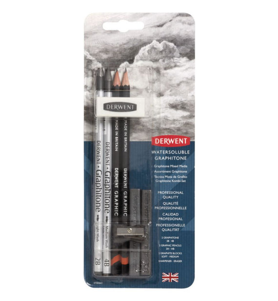 Water-Soluble Graphitone Mixed Media Set: incluye dos barras de grafito soluble en agua (2B, 8B), dos lápices gráficos (2H, HB), dos bloques de grafito (suave, medio), una goma de borrar de plástico y un sacapuntas.