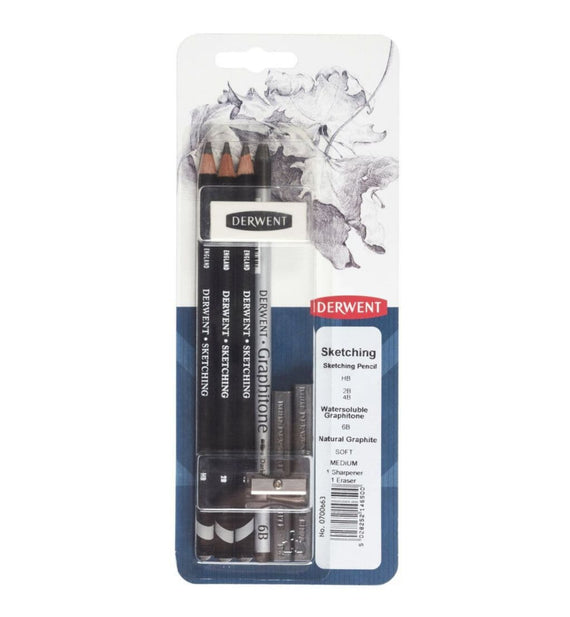 Los juegos de medios mixtos de Derwent contienen lápices de bocetos o de dibujo junto con el sacapuntas y el borrador apropiados.