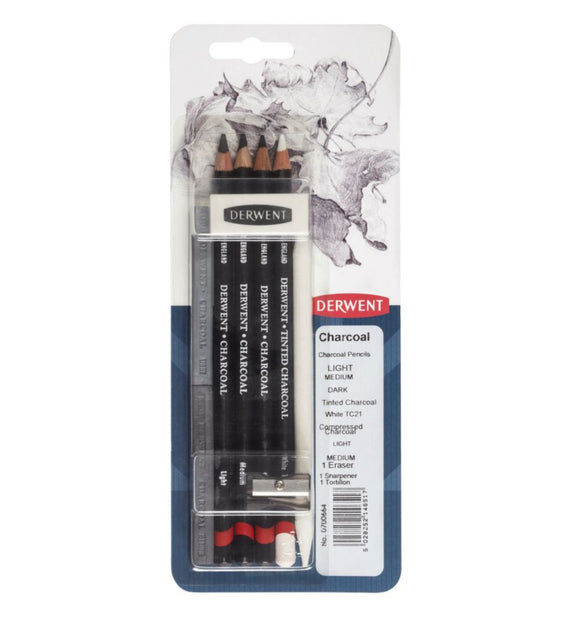 Charcoal Mixed Media Set: incluye tres lápices de carbón (claro, medio, oscuro), un lápiz de carbón teñido (blanco), dos bloques de carbón (claro, mediano), una goma de borrar de plástico, un sacapuntas y un muñón de papel.