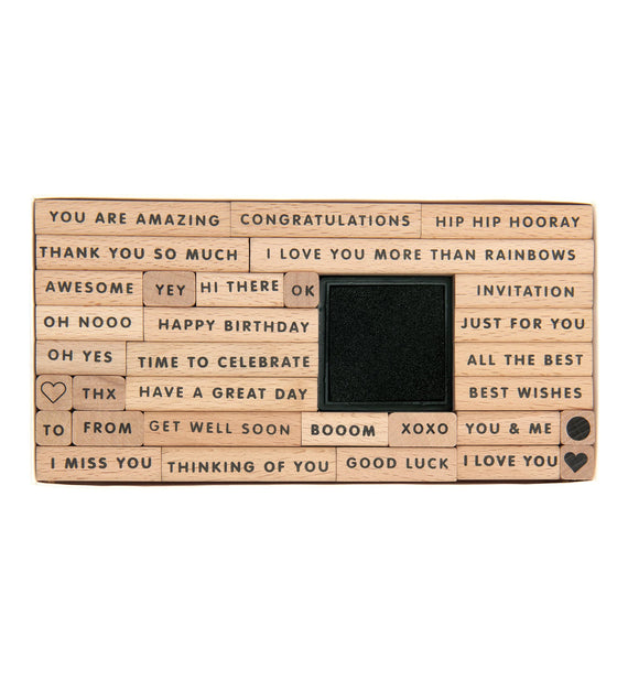 Estos juegos de sellos están disponibles en varios temas y diseños. Cada juego incluye sellos de madera con extremos de goma y una almohadilla de tinta.