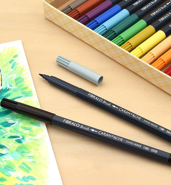 La punta de fieltro Fibralo™ es un bolígrafo de alta calidad con punta de fibra soluble en agua, garantizado contra el secado de la tinta. Los colores son brillantes y transparentes. Para obtener un efecto de acuarela utilizando los bolígrafos con punta de fibra Fibralo™, no necesita una paleta; simplemente use la punta humedecida del bolígrafo directamente sobre papel blanco para crear los efectos deseados.