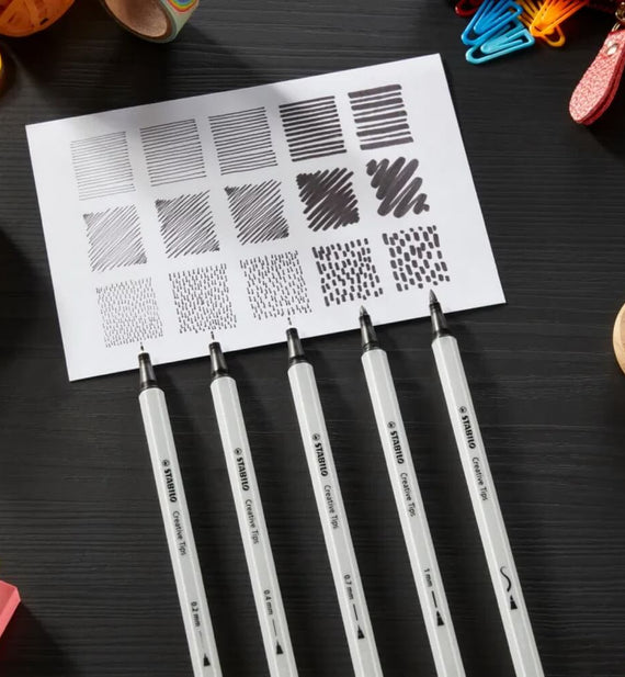 El juego incluye 5 bolígrafos negros: los tamaños son 0,2 mm, 0,4 mm, 0,7 mm, 1 mm y una punta de cepillo flexible