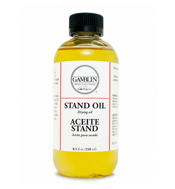 El aceite de pie de Gamblin, está fabricado calentando un aceite de linaza refinado puro, es un aceite pesado que humedece bien los pigmentos. El aceite de stand es aceite de linaza que ha sido polimerizado por calentamiento. Es más espeso que los aceites refinados alcalinos o prensados ​​en frío, y casi no tiene tendencia a amarillear. Es útil para acristalamiento
