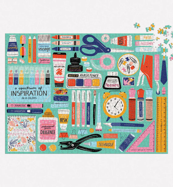 Este rompecabezas de 1000 piezas muestra una variedad de suministros brillantes y coloridos como marcadores, bolígrafos, pegamento, tijeras y más para una experiencia de rompecabezas divertida y desafiante