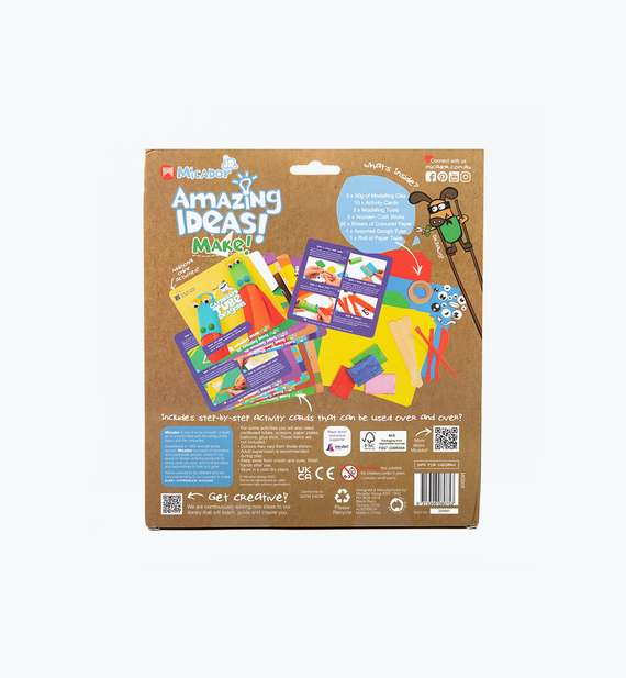 Fomenta la creatividad, la imaginación y el juego abierto con Micador jR. Ideas increíbles. Cada paquete permite a los niños desarrollar sus habilidades motoras finas y sus procesos cognitivos con una gama de actividades y materiales apropiados para su edad que excitan, inspiran y empoderan. ¡Elige entre Draw or Make varieties para 7 horas de creación y juego sin fin! Incluye tarjetas de actividad y actividades adicionales en línea para una experiencia sensorial única.
