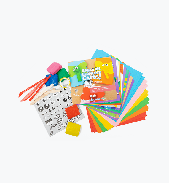 10 x tarjetas de actividad, 5 x 50 g de arcilla para modelar, 1 x herramienta de modelar, 3 x palos de artesanía de madera, 30 x hojas de papel de color, 10 x ojos googly surtidos, 1 x rollo de cinta de papel
