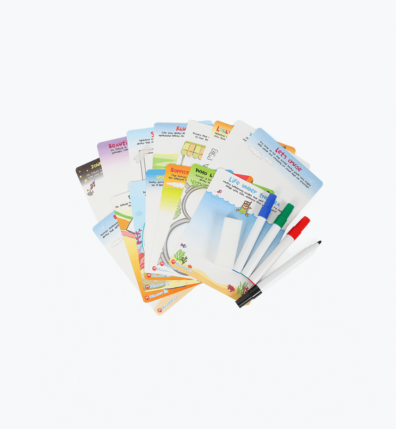 • Incluye 15 tarjetas de actividad reutilizables, 4 marcadores de borrado en seco de colores y 1 borrador en seco