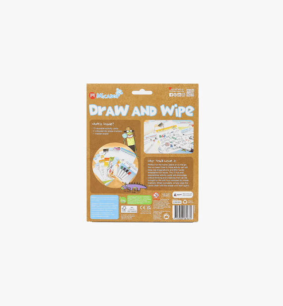 Este paquete de actividades completo y de bajo desorden es perfecto para los niños en movimiento. Con tarjetas de actividad limpias, marcadores de borrado en seco y un borrador de marcadores, Micador jR. ¡Draw and Wipe es genial para casa o cuando estás en movimiento! Las indicaciones de dibujo abiertas fomentan la creatividad y la imaginación durante horas de diversión. Cuando esté completo, simplemente limpie las tarjetas y comience de nuevo.