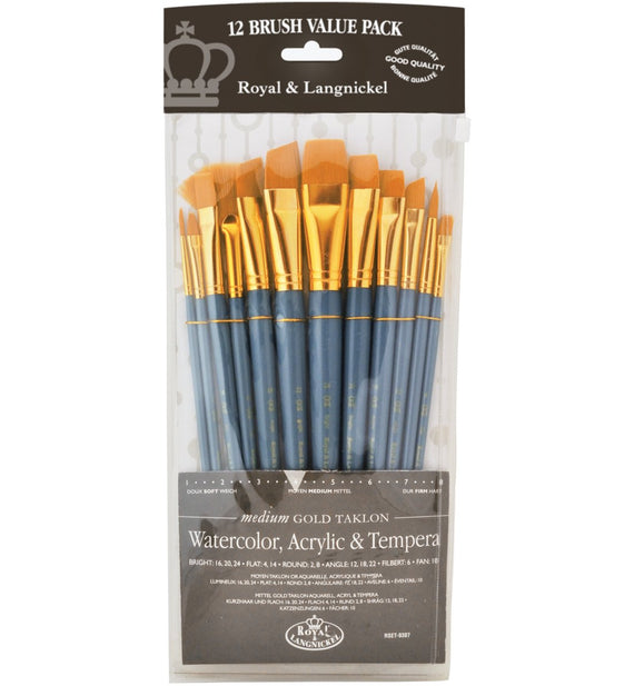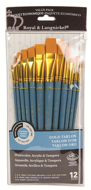 Set de 12 pinceles Taklon oro, cerdas de firmeza media, para Acuarela, Acrílico o Témpera.