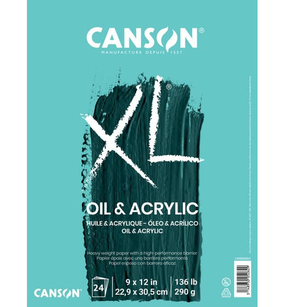 La almohadilla de aceite y acrílico Canson XL de 9" x 12" cuenta con un papel con textura a prueba de sangrado, similar a un lienzo, que está listo para usar con aceite o acrílico sin necesidad de imprimación o preparación. Cada almohadilla plegable sin ácido contiene 24 hojas de papel de 136 lb.