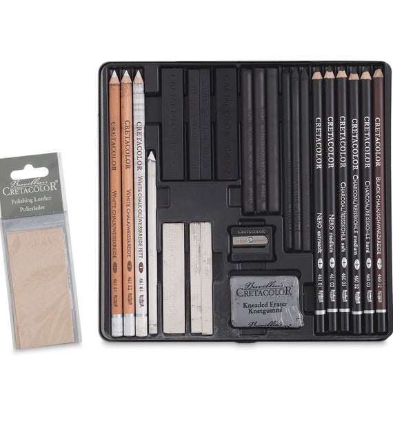 Cretacolor Black & White Box cuenta con 25 herramientas de dibujo de alta calidad para crear imágenes con posibilidades de rango tonal. .Este juego incluye 25 piezas para todas las necesidades de dibujo