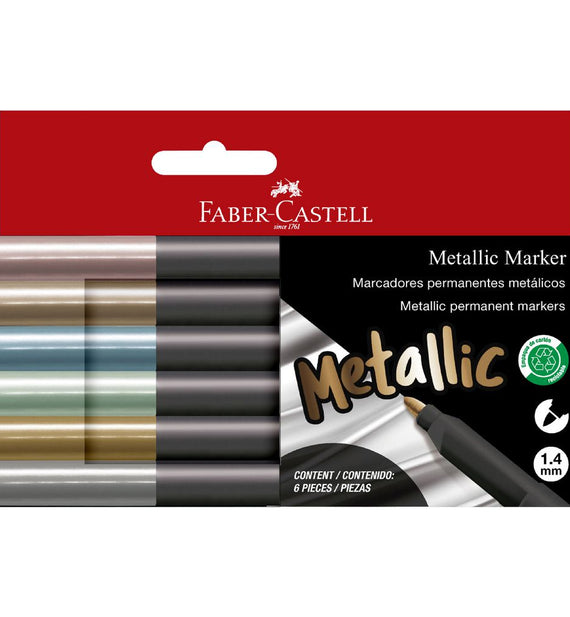 Marcador permanente al agua en colores metálicos intensos. Punta cónica de 1.4mm ideal para trabajos de personalización. Blister x 6 colores. Apto para la mayoría de superficies como: madera, metal, cerámica, plástico o superficies oscuras como cartulina negra.