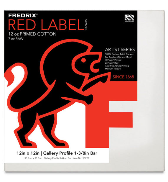 Fredrix Red Label Canvas cuenta con un lienzo de pato de algodón de calidad superior con doble imprimación que está preestirado y listo para pintar. El perfil de galería extra profundo de 1-3/8" está grapado en la parte posterior para una presentación limpia, incluso si no está enmarcado.