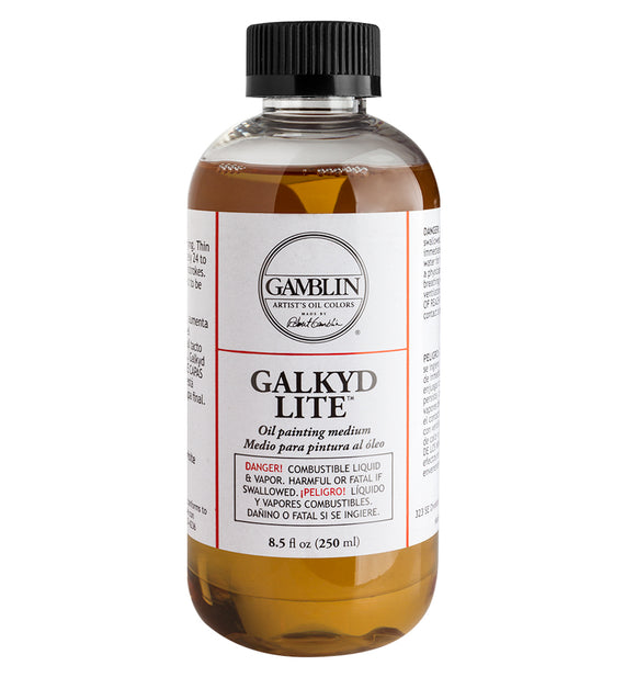Galkyd Lite diluye los colores al óleo y aumenta la transparencia y el brillo. Cuando se usa con moderación con colores al óleo, Galkyd Lite retiene las pinceladas. Galkyd Lite es más fluido y menos brillante en comparación con Galkyd. Las capas finas estarán secas al tacto en 24 a 30 horas.