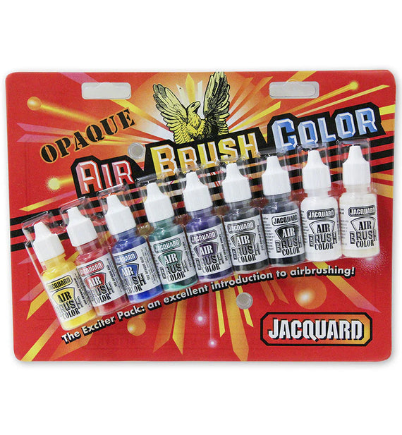Cada paquete contiene ocho botellas de 0,5 onzas de cada color más una botella de 0,5 onzas de barniz transparente. El paquete Opaque Airbrush Exciter Pack contiene tintas opacas amarillas, rojas, azules, verdes, violetas, sepia, negras y blancas. El Metallic Airbrush Exciter Pack contiene tintas amarillas metálicas, rojas, azules, oro verdadero, oro solar, plata, cobre y blancas. El paquete de excitación de aerógrafo transparente incluye tintas transparentes amarillas, rojas, azules, verdes, violetas, marrones, negras y blancas.