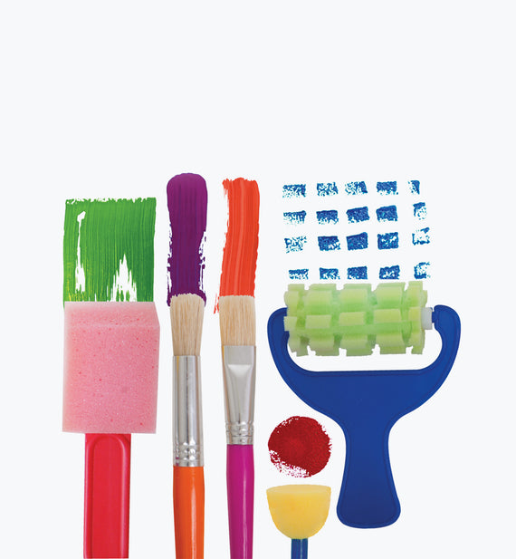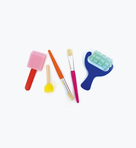 Accesorios divertidos y para niños que incluyen: 1 cepillo plano Colourfun, 1 cepillo redondo Colourfun, 1 rodillo de espuma estampado (75 mm), 1 cepillo de espuma (50 mm) y 1 estampador redondo.