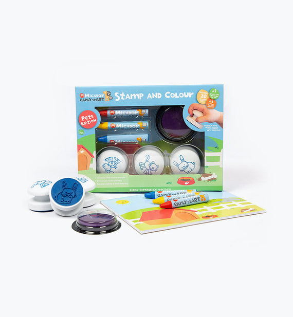 Las actividades incluidas se centran en la aritmética y las habilidades lingüísticas. Cada paquete incluye tres sellos, una almohadilla de tinta lavable, 20 hojas de actividad y tres lápices de colores. El embalaje y las actividades se imprimen en materiales de mezcla FSC. Recomendado para mayores de 3 años.