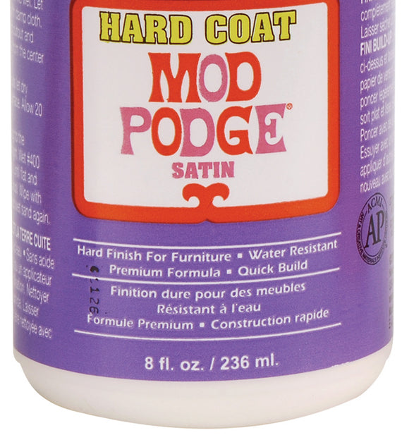MOD PODGE-8 onzas de Hard Coat Satin Mod Podge. Un acabado duro para muebles. Fórmula premium resistente al agua, construcción rápida y libre de ácidos. Base agua y no tóxico. Aplicar con aplicador de brocha o esponja.