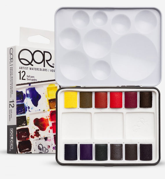 El color profundo, rico y hermoso de QoR con su exclusivo aglutinante Aquazol proporciona más pigmento en cada pincelada, al tiempo que conserva las mejores cualidades de las acuarelas tradicionales. La fuerza, la versatilidad y ahora la comodidad y la movilidad son parte de la historia de Qor. El mini juego de acuarela QoR alberga 12 acuarelas de media sartén en una lata más pequeña que una tarjeta de índice. Cabe perfectamente en el bolsillo o en el bolso para el boceto urbano y la pintura al aire libre. Este conjunto incluye prímula de color amarillo cadmio, amarillo azo de níquel, naranja pirrol transparente, medio rojo pirrol, quinacridona magenta, púrpura dioxazina, azul ultramarino, azul pthalo (tono verde), verde savia, gris de Payne, óxido marrón transparente y umber quemado.