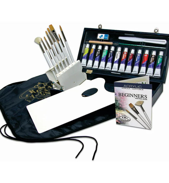 Este conjunto completo viene en una elegante caja de madera y contiene once pinceles Taklon dorados con asas de madera lacadas, doce tubos de pintura acrílica, un lápiz 2B, un punzón, un delantal, una paleta, un lápiz y un borrador.