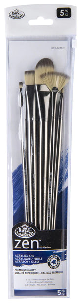 La línea de cepillos Zen cuenta con mezclas exclusivas de filamentos y cabello, una amplia selección de tamaños y estilos y asas impermeables metalizadas. Los pinceles están diseñados para satisfacer las necesidades de los artistas principiantes, intermedios y avanzados que trabajan en una variedad de medios. La línea completa incluye seis series de pinceles, cada una con su propio propósito. Cada juego contiene cinco pinceles en una variedad de estilos y tamaños.