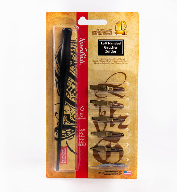 Este juego de bolígrafos para zurdos contiene cinco puntas de la serie LC con tres depósitos, más una punta 513EF para escritura de líneas finas. El juego también incluye un portabolígrafos Speedball clásico y una hoja de instrucciones de caligrafía detallada.